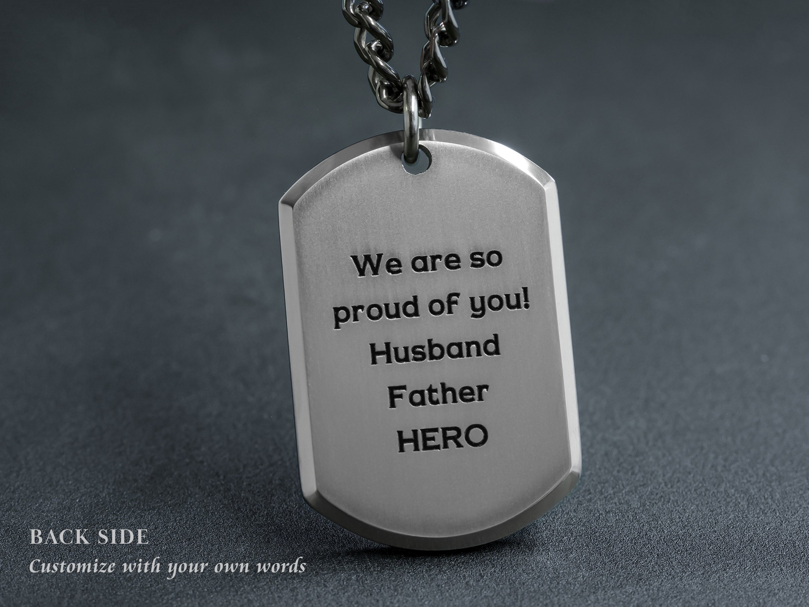 Unique, meaningful gift for soldiers, military couples, military dad and families, or those who want to show their patriotic pride! Customize your own solid titanium pendant with words that inspire you, motivate you, or help you feel close to your loved ones back home.