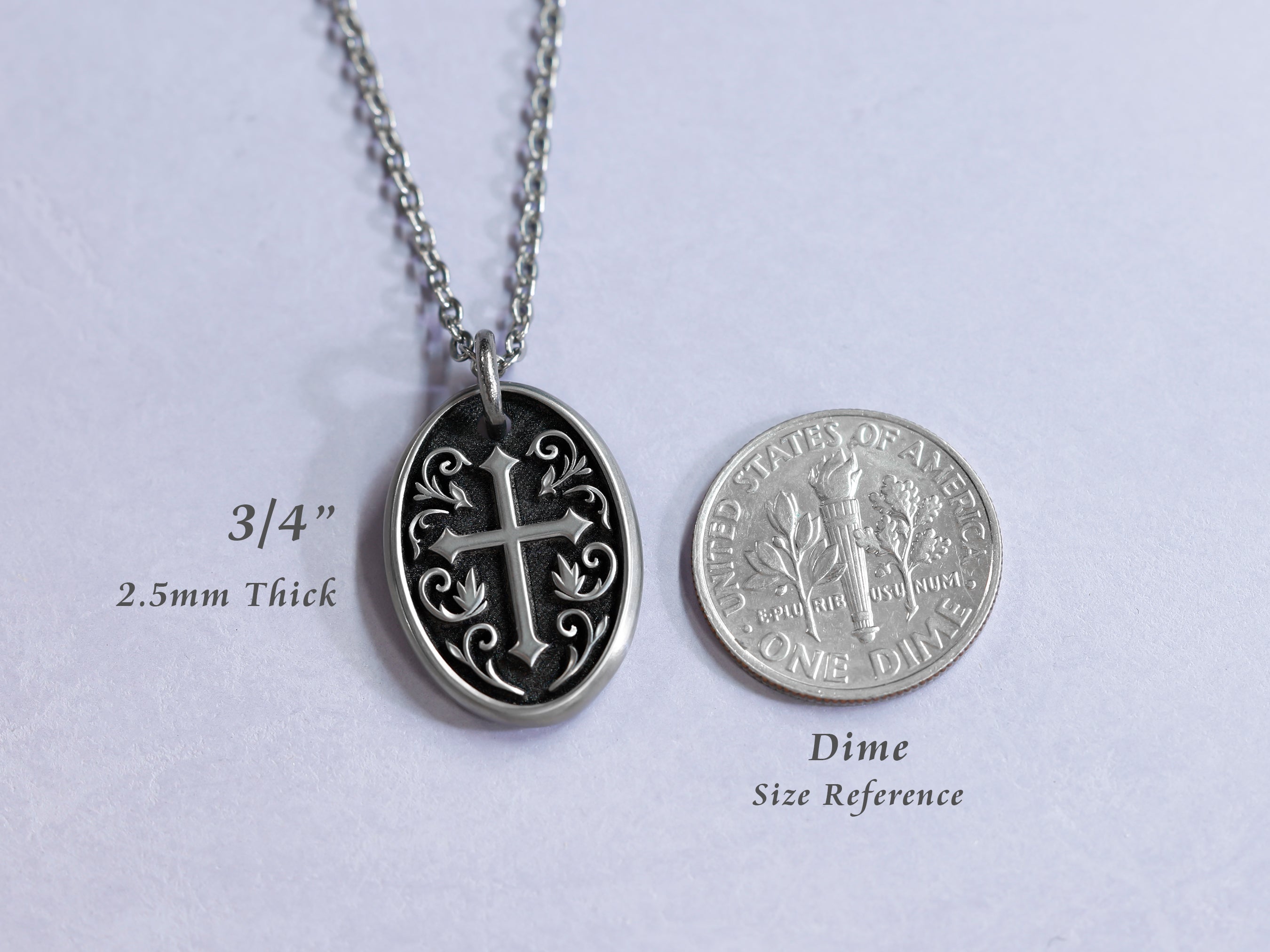 Carry your strength with you. Our Custom Titanium Cross Necklace is a symbol of strength and faith. Deeply etched into a beautiful oval pendant, the ornate cross design reminds you that you’re never walking alone—your strength is rooted, steady, and guided.