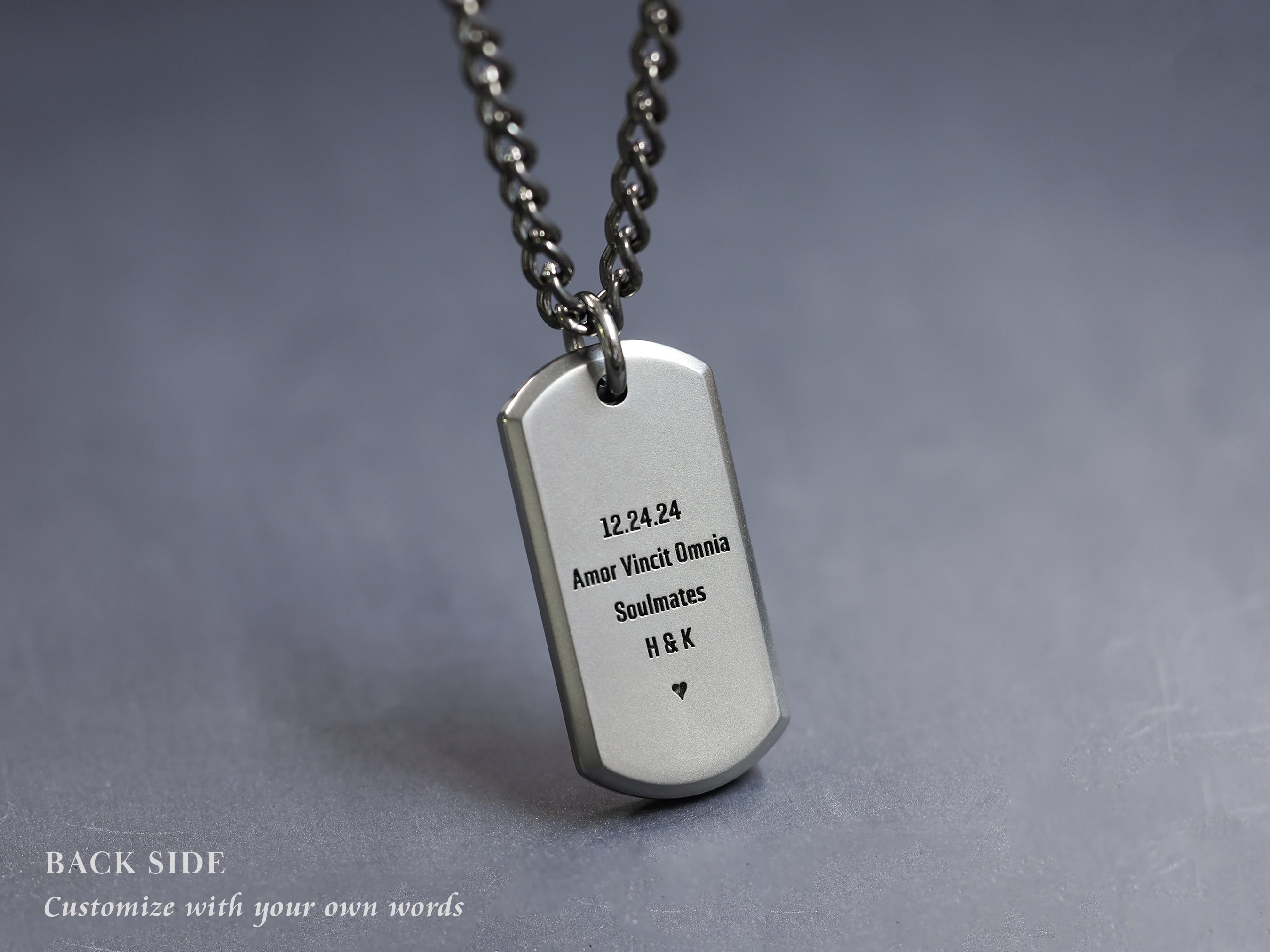 The backside of this pendant can be left blank or can be deep engraved with any text of your choice. We can fit up to 7 lines of text with 16 characters (letters, numbers, punctuation) per line.