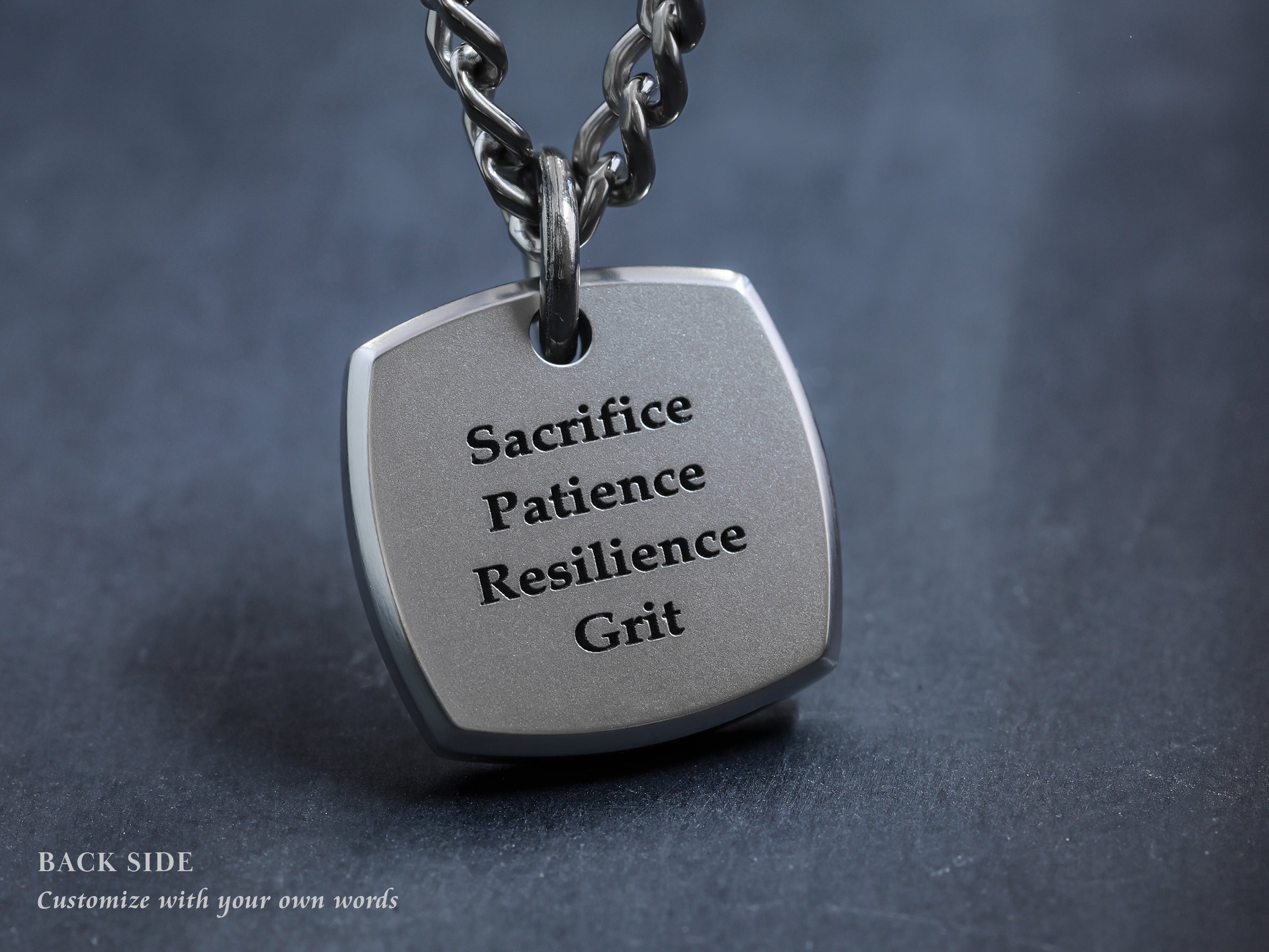 The backside of this pendant can be left blank or can be deep engraved with any text of your choice. We can fit up to 5 lines of text with 13 characters (letters, numbers, punctuation) per line.
