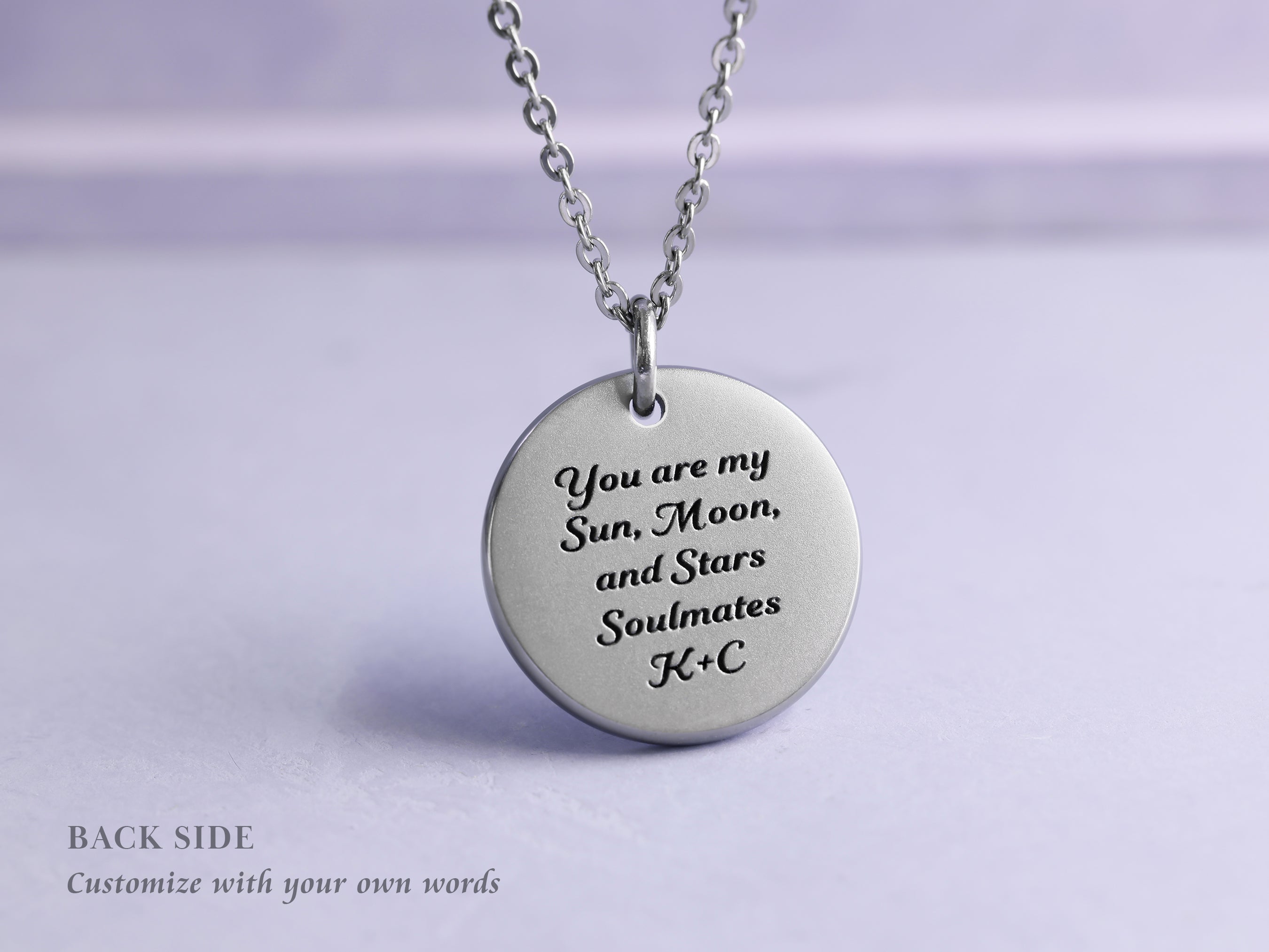 The backside of this pendant can be left blank or can be deep engraved with any text of your choice. We can fit up to 4 lines of text with 13 characters (letters, numbers, punctuation) per line.